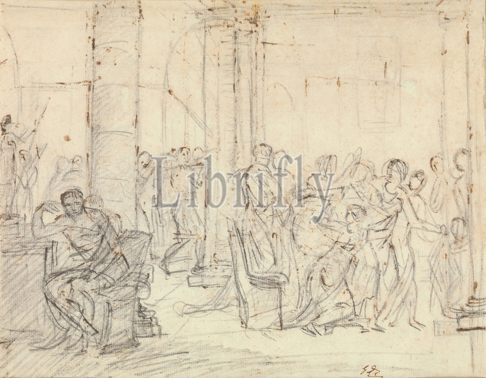 Study, Lictors Bringing Brutus, Bodies, Sons, ca, 1788, Black chalk, brown ink, paper, 9 7/16 x 12 1/8, 23.9 30.8 cm, Drawings, Jacques Louis David, French, Paris, 1748–1825, Brussels, drawing, numerous studies, David, masterly, painting, Louvre, subject, drawn, Roman Republican, history, describes, return, sons, Brutus, burial, flourished 510, B