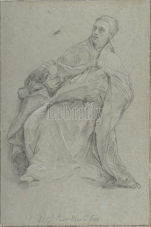 Study, Seated Prelate, Saint Gergory, Great, 1685–86, Black chalk, highlighted, white, blue-gray paper, 15-3/8 x 10-1/4, 39.1 26.0 cm, Drawings, Carlo Maratti, Italian, Camerano, 1625–1713, Rome, drawing, represents, study, slight variations, seated figure, Gregory, right, ‘ Dispute, Doctors, Church, Immaculate Conception, painted, installed, main altarpiece, Cybo chapel, church, Santa Maria, del, Popolo