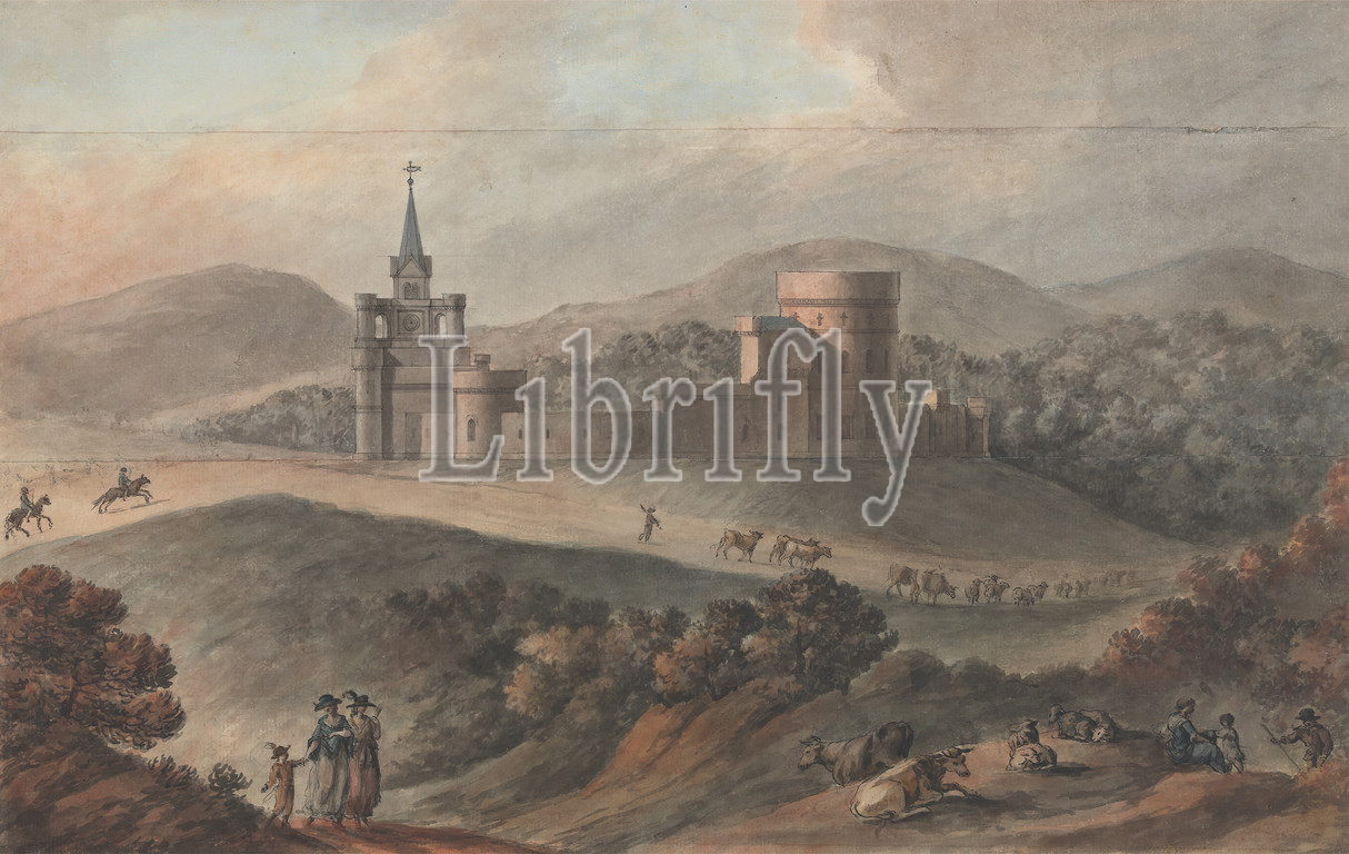 Study, Stable Court, Kirkdale, Wigtownshire, Scotland, Robert Adam, 1728–1792, British, 1770, 1780, Watercolor, pen, black ink, gouache, graphite, medium, moderately textured, blued white laid paper, 3 sheets, paper hinged together, Sheet, architectural subject, castle, cattle, children, cows, genre subject, grazing, hats, hills, horses, animals, landscape, livestock, men, mountains, paths, riders, horseback, staff, steeple, study, visual work, travel, trees, walking, walls, women, Dumfries, Galloway, Kirkdale, Scotland, United Kingdom, Wigtownshire