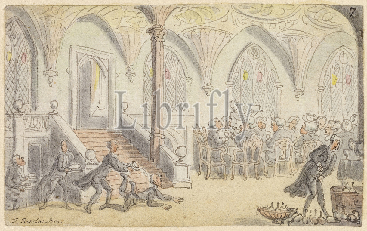 Study for Dr. Syntax Entertained at College, c. 1828, Thomas Rowlandson, English, 1756-1827, England, Pen and brown ink with brush and watercolor on ivory laid paper, 65 × 106 mm