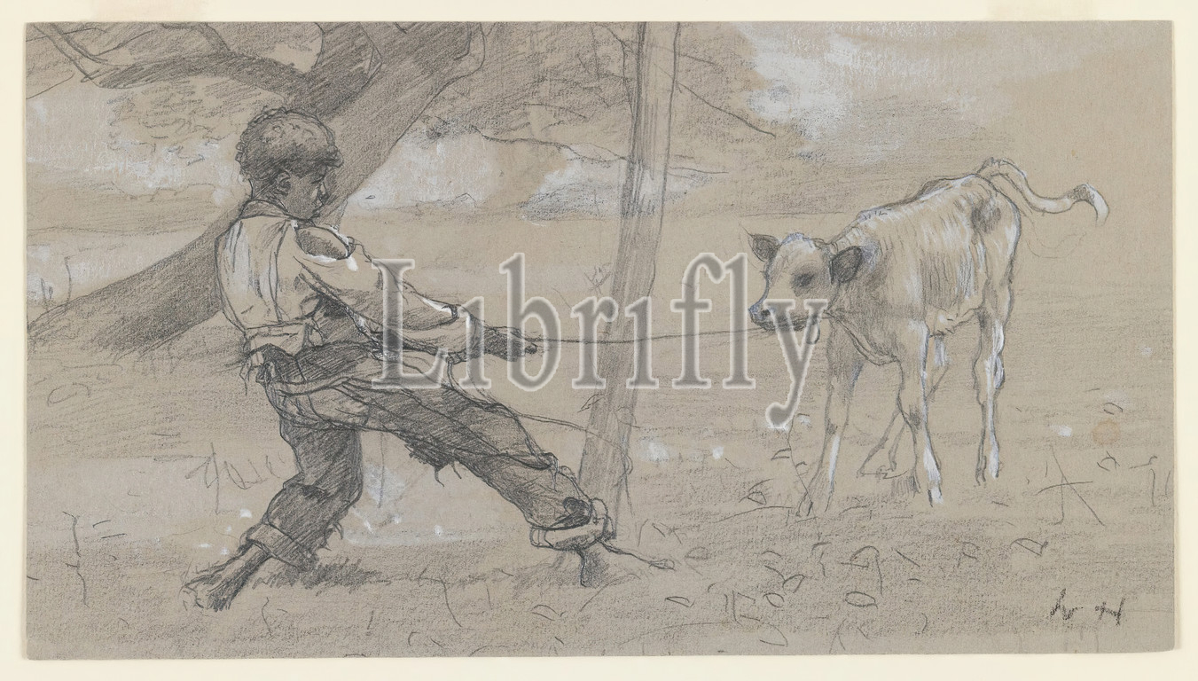 Study for 'The Unruly Calf', Winslow Homer, American, 1836-1910, Graphite and white opaque watercolor on blue-grey, moderately thick, moderately textured wove paper, ca. 1875, Sheet: 4 11/16 x 8 1/2 in., 11.9 x 21.6 cm, boy, cow, drawing, farm, fine lines, graphite, stubborn, watercolor
