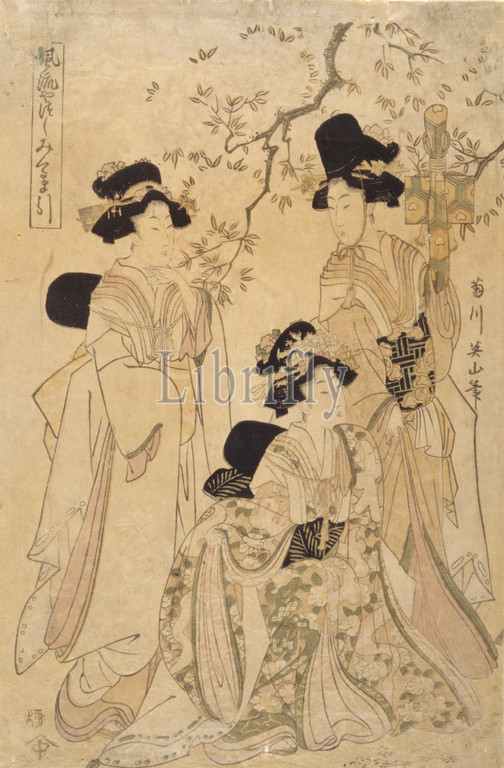Stylishly Casual Adaptation, Drawing, Court Wagon 風流やつしみくるま引き, Fūryū yatsushi mikuruma hiki, Kikukawa Eizan, Japanese, 1787-1867, Edo, 1805, Color Woodblock Print, 15-3/8 x 10-3/8, Signed, artist, Kikukawa Eizan hitsu 菊川英山筆 Censor's seal, Kiwame 極 Publisher's mark, Oyama-ya Hangorō 小山屋半五郎, Asian Art