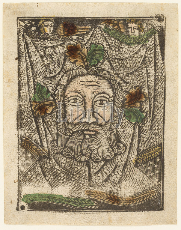 The Sudarium, 1460–65, Bavarian, 15th century, Germany, Metalcut in black hand colored with brush and watercolor in yellow, red-brown lake, and green, on ivory laid paper, with manuscript text in pen and brown ink on verso, 100 × 75 mm (plate), 105 × 80 mm (sheet)