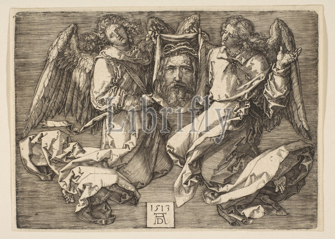 Sudarium Displayed, Two Angels, 1513, Engraving, Sheet, 4 1/16, 1 11/16, 10.3, 4.3 cm, Prints, Albrecht Dürer, German, Nuremberg, 1471–1528
