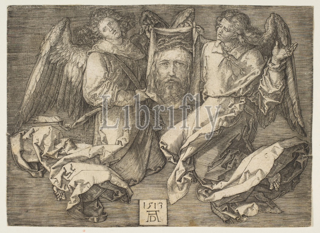 Sudarium Held by Two Angels, 1513, Engraving, Sheet: 4 in. × 5 1/2 in. (10.1 × 13.9 cm), Prints, Albrecht Dürer (German, Nuremberg 1471–1528 Nuremberg)