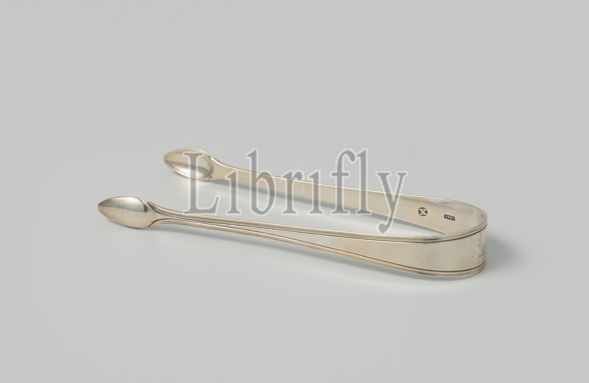 Sugar tongs, helmet sign Clifford, two handles, form, pointed oval spoon bowl, connected, curved, widening center-widening handle, outside, stem, profile runs, edges, helmet mark Clifford, engraved, center, Diederik Lodewijk Bennewitz, Amsterdam, 1806, black-and-white, metal, engraving, l 13 8