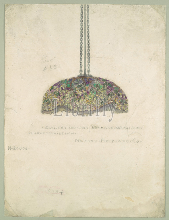 Suggestion, 38, Hanging Shade/ Laburnum Design/ Marshall Field, Co, 1907–10, New York, United States, American, Watercolor, graphite, off-white wove paper, 11 15/16 x 8 7/16, 30.4 21.4 cm, Drawings, Tiffany Studios, 1902–32, laburnum, poisonous tree, native, Europe, bears dense, clusters, bright yellow, flowers, spring, inspiration, decoration, lamp, Chicago department, store, Marshall, Field, Company commissioned, monumental hanging, Laburnum, shade, twenty-eight inches, diameter, decorate, sell, furnishings