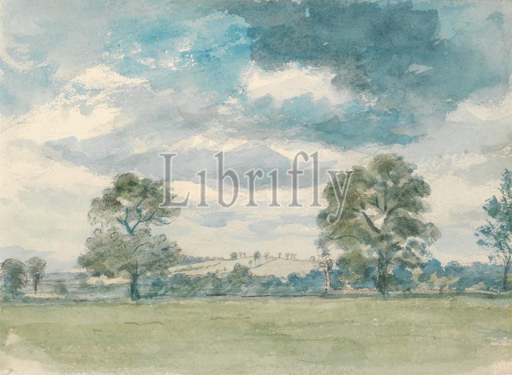 Summer Landscape, Lionel Constable, 1828–1887, British, ca, 1825, Watercolor, graphite, medium, moderately textured, cream wove paper, Sheet, clouds, landscape, moon, sheep, summer, trees