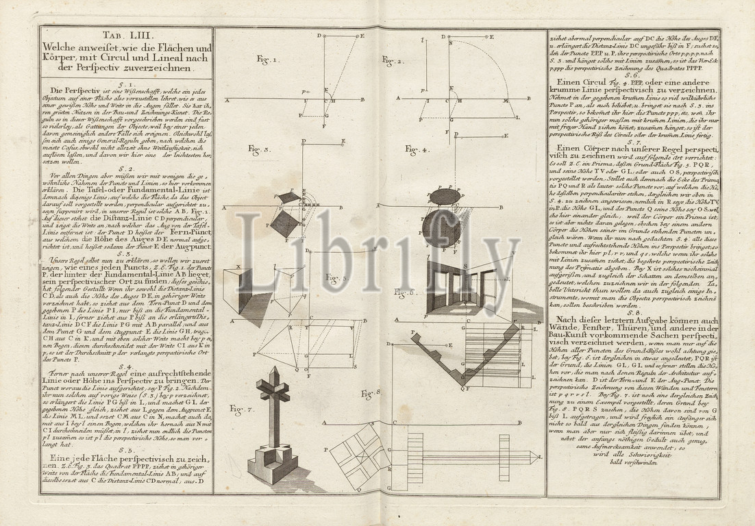 Surfaces and body, with Circul and ruler after the Perspectiv attributed, Basic rules for perspective drawing with compass and ruler, Tab. LIII, p. 60, Tobias Mayer: Mathematischer Atlas, in welchem auf 60 Tabellen alle Theile der Mathematic vorgestellet und nicht allein überhaupt zu bequemer Wiederholung, sondern auch den Anfängern besonders zur Aufmunterung durch deutliche Beschreibung und Figuren entworfen werden. Augspurg: Pfeffel, 1745