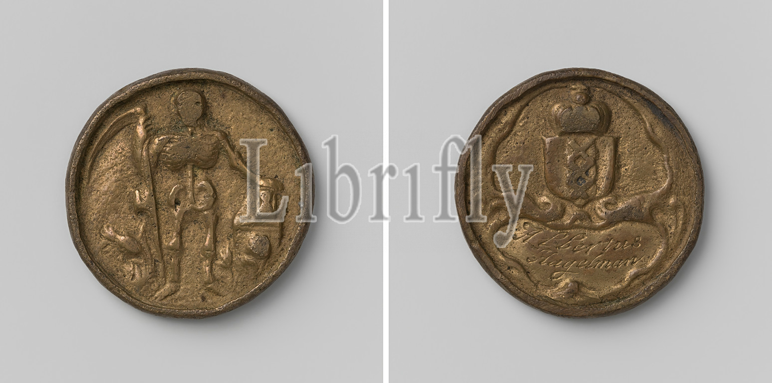 Surgeons' guild in Amsterdam, guild token by student Albertus Hagelman, Brass medal. Obverse: Dead, depicted as a skeleton, in a flower field with a scythe in the right hand and with the left hand on an hourglass, which stands on a pedestal. Reverse: crowned coat of arms above cartouche with inscription, Amsterdam, Albertus Hagelman, anonymous, 1690, brass (alloy), engraving, d 3.4 cm × w 16.78 gr