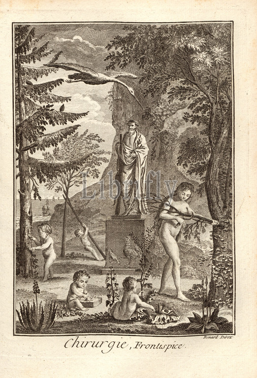 Surgery, Frontispiece, Allgoric representation, surgery, orthopedics, healing, medicinal plants, statue, Aesculapius, Asklepios, Signed, Benard direx, frontispice, p. 48, Benard, dir., 1778, Denis Diderot, M, d'Alembert, Encyclopédie, dictionnaire raisonné des sciences, des arts, des métierss, des métiers, Genève, chez Pellet, MDCCLXXVIII 1778