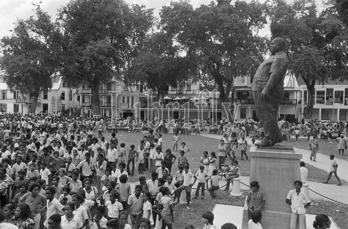 Suriname; mass of school children rehearsing at Oranjeplein with Pengel statue at right, November 23, 1975, Statues, rehearsals, school children, The Netherlands, 20th century press agency photo, news to remember, documentary, historic photography 1945-1990, visual stories, human history of the Twentieth Century, capturing moments in time
