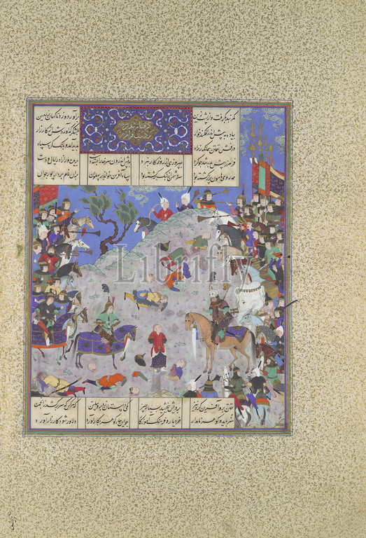 Surkha Captured, Faramarz, Condemned, Rustam, Folio 204v, Shahnama, Book, Kings, Shah Tahmasp, ca, 1525–30, Iran, Tabriz, Opaque watercolor, ink, silver, gold, paper, Painting, H, 11 3/16, 28.4 cm, Codices, Painting attributed to Qasim ibn 'Ali, active ca., 1525–60, hero, shown, horseback wearing, leopard-skin hat, launched war, avenge, death, Siyavush, whom, Turanian king, Afrasiyab, executed, determined, cause Afrasiyab, pain, having, son, Surkha, captured, killed