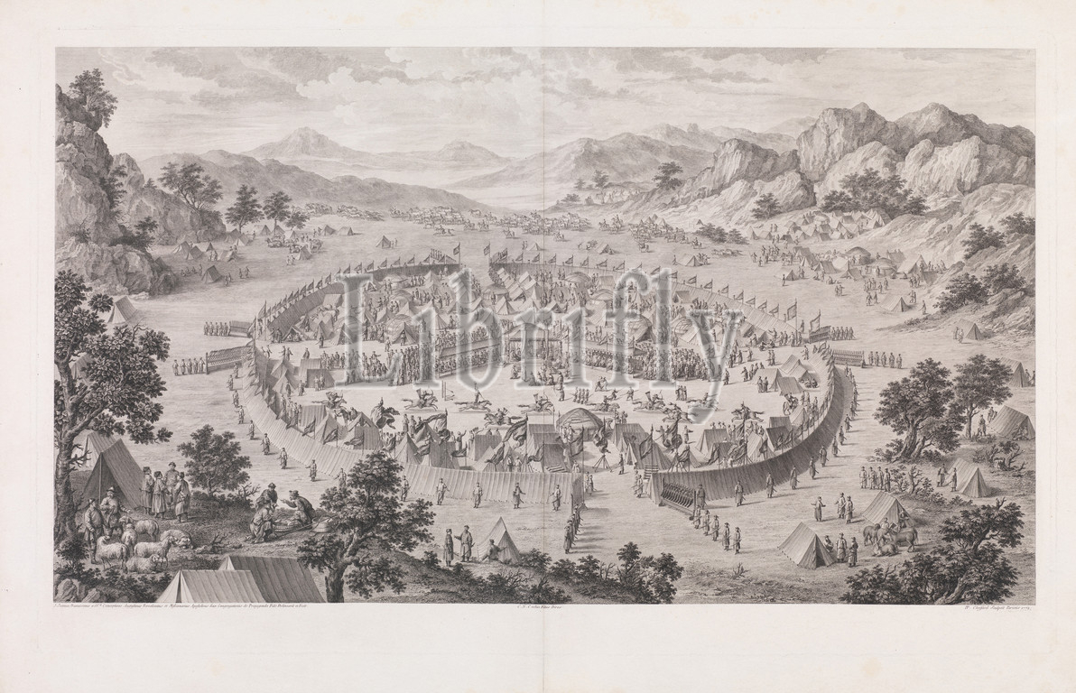 Surrender, Khan, Badakhsan, 1772, Etching, engraving, Sheet, 25 3/4, 39 9/16, 65.4, 100.5 cm, Prints, Pierre Philippe Choffard, French, Paris, 1730–1809, after Jean Damascene, Rome, 1727–1781, Beijing, direxit, Charles Nicolas Cochin II, 1715–1790, print, khan, Badakhsan surrendering, Qing forces, 1759, illustrates, typical Manchu, military, encampment, enclosed, within, circular perimeter, center, granted, audience, cavalrymen, present, display, martial skills, horsemanship