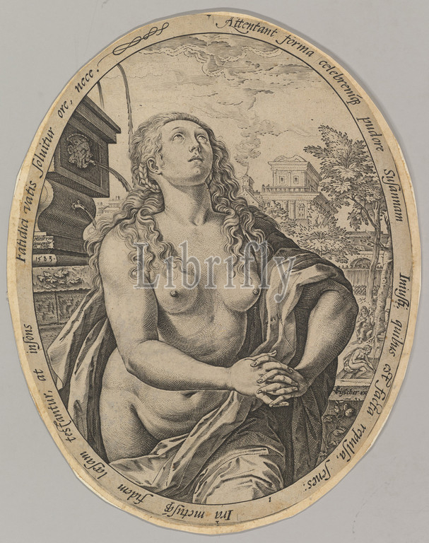 Susanna, 1583, Engraving, second state, two, Oval sheet, 7 5/16 x 5 11/16, 18.6 14.5 cm, Prints, Hendrick Goltzius, Netherlandish, Mühlbracht, 1558–1617, Haarlem