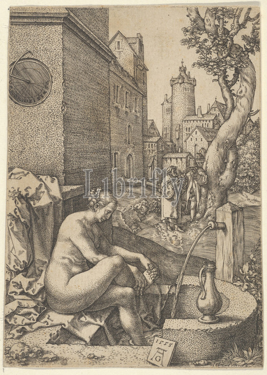 Susanna Surprised, Elders, Story, Susanna, 1555–80, Engraving, first state, three, Sheet, 4 7/16, 3 3/16, 11.3, 8.1 cm, Prints, Heinrich Aldegrever, German, Paderborn ca., 1502–1555/1561, Soest, seated, foreground, left, washes, feet, fountain, background, center, elders, front, tree, city visible, Based, Daniel 13, 1-16, Plate 1, series, four engravings