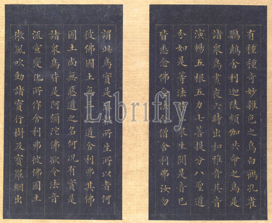 Sutra, Eternal Life, Wu liang shou jing, Sanskrit, Sukhavati-vyuha, Amitayus, Lin Zexu, Calligrapher, Chinese, 1785-1850, Qing dynasty, period, Daoguang, 1837, gold paint, blue paper, 1-1/8 x 7-1/4 x 12-1/8, Colophons, Chen Baoshen, Lin Yongyu, Wu Yuan Signed, Seal, Zixu hanmo, Cixhen Minfu, Asian Art