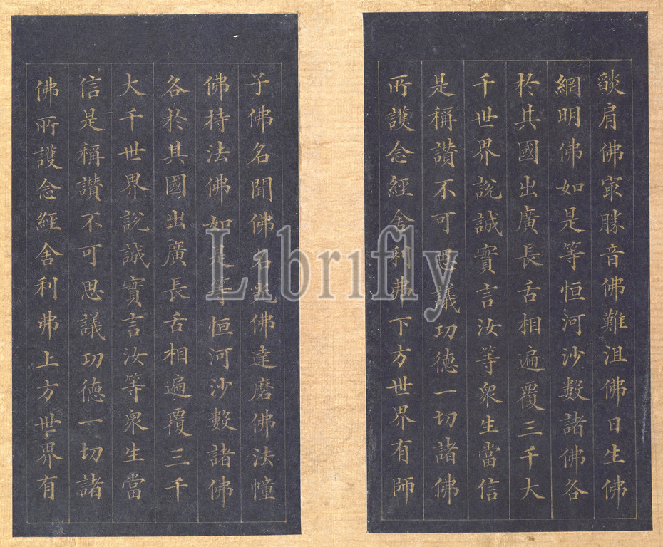 Sutra, Eternal Life, Wu liang shou jing, Sanskrit, Sukhavati-vyuha, Amitayus, Lin Zexu, Calligrapher, Chinese, 1785-1850, Qing dynasty, period, Daoguang, 1837, gold paint, blue paper, 1-1/8 x 7-1/4 x 12-1/8, Colophons, Chen Baoshen, Lin Yongyu, Wu Yuan Signed, Seal, Zixu hanmo, Cixhen Minfu, Asian Art
