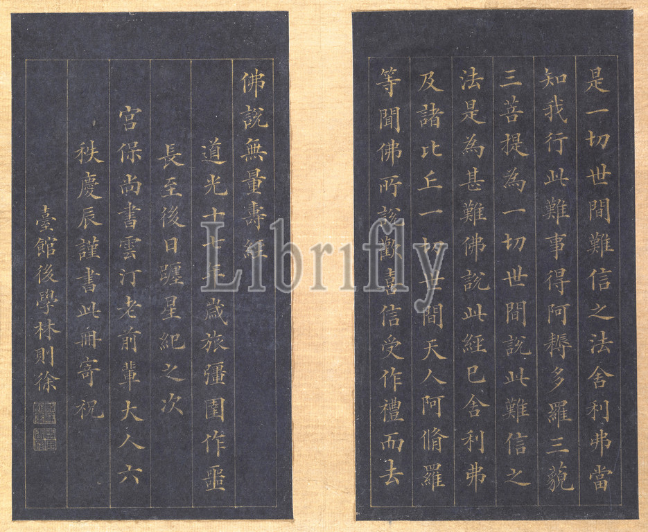 Sutra, Eternal Life, Wu liang shou jing, Sanskrit, Sukhavati-vyuha, Amitayus, Lin Zexu, Calligrapher, Chinese, 1785-1850, Qing dynasty, period, Daoguang, 1837, gold paint, blue paper, 1-1/8 x 7-1/4 x 12-1/8, Colophons, Chen Baoshen, Lin Yongyu, Wu Yuan Signed, Seal, Zixu hanmo, Cixhen Minfu, Asian Art