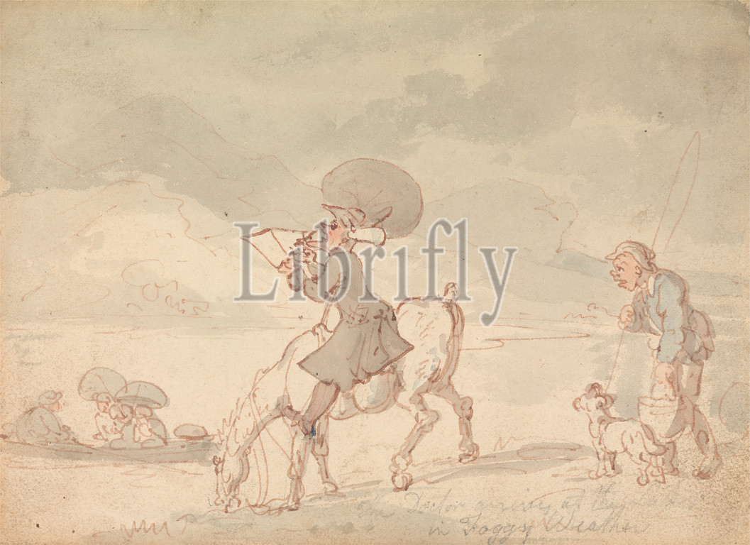 Dr, Syntax Sketching, Lake, Thomas Rowlandson, 1756–1827, British, 1812, Watercolor, pen, red ink, graphite, medium, slightly textured, cream wove paper, Sheet, boy, elderly, figures, genre subject, horse, animal, lake, man, pail, paper, fiber product, sketching, umbrellas