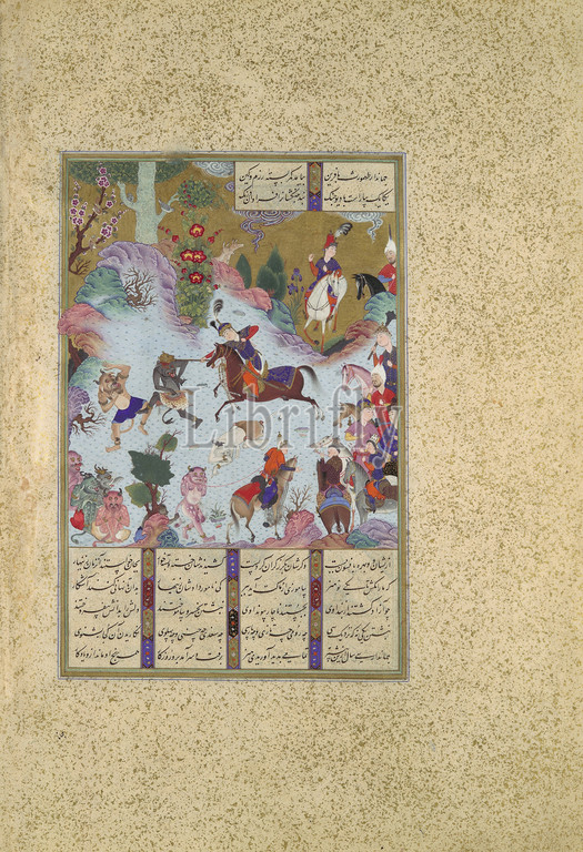 Tahmuras Defeats, Divs, Folio 23v, Shahnama, Book, Kings, Shah Tahmasp, ca, 1525, Iran, Tabriz, Opaque watercolor, ink, silver, gold, paper, Painting, H, 11 1/8, 28.3 cm, Codices, Painting attributed to Sultan Muhammad, active first half 16th century, Tahmuras, shown, galloping across, meadow, defeated, divs, demons, exchange, lives, taught, art, writing, work, attributed, Sultan, master painter, chief administrator, first generation, artists, manuscript