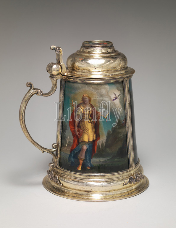 Tankard, 1649, Swiss, Zurich, Silver gilt, verre églomisé, H. 7 1/8 in. (18.1 cm.); W. with handle 6 5/8 in. (16.8 cm); Diam. 5 1/2 in. (14 cm), Metalwork-Silver In Combination, The arms on the lid (Rahn impaling Escher) are those of Hans Heinrich Rahn (1593–1669), who married Ursula Escher in 1612. He became a Burghermaster of Zurich in 1655. The personification of Faith, Hope, and Charity are variants of the figures in an engraving by Dietrich Meyer