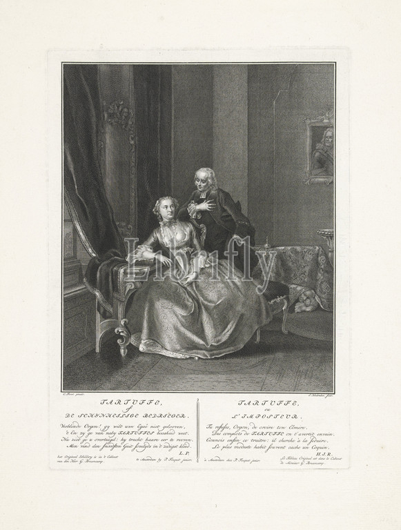 Tartuffe, hypocrite deceiver, Interieur, lady, Elmire, gentleman, background, second man, Orgon, under, table, Scene, play Tartuffe van Molière, 1664, dressed, frock, deep cleavage sits, chair, right arm leaning, thick book, character Tartuffe, tries, seduce, background you, see, husband Orgon watches, two under, list, Elmire convinces, husband, blind faith, religious fanatic, abused, comedy, clothes, men's clothes, dress, gown, robe volante, eavesdropper, Intention, Purpose, Aim, Jacob Houbraken, mentioned, object, Amsterdam, 1760, 1780, paper, engraving