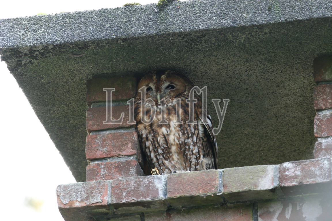Tawny Owl perched in Chimney, Strix aluco