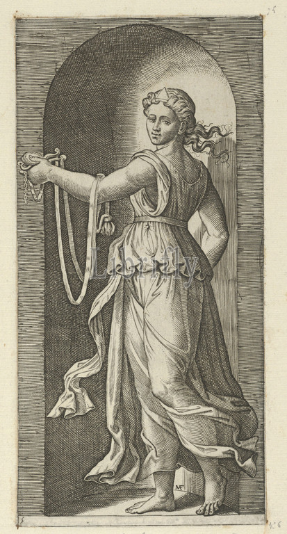 Temperance personfied, woman standing, niche holding, bit, Virtues, ca, 1515–25, Engraving, Plate, 8 5/8, 4 1/4, 21.9, 10.8 cm, Prints, Marcantonio Raimondi, Italian, Argini, ca., 1480–before, 1534, Bologna, After Raphael, Raffaello Sanzio or Santi, Urbino, 1483–1520, Rome