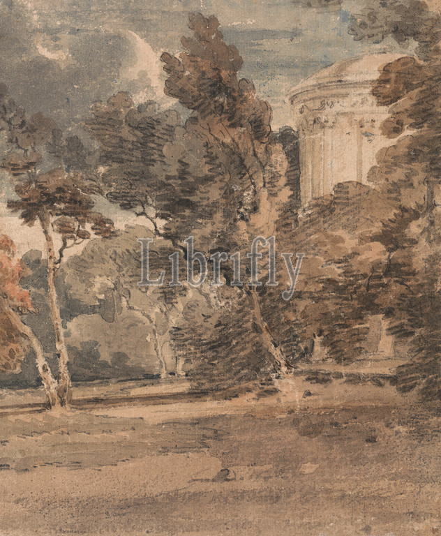 Temple, Harewood Park, Thomas Girtin, 1775–1802, British, ca, 1798, Watercolor, gouache, black chalk, graphite, medium, slightly textured, beige laid paper, Sheet, architectural subject, landscape, park, grounds, sky, temple, trees, England, Europe, Harewood Park, Hereford, Herefordshire, Ross-on-Wye, United Kingdom