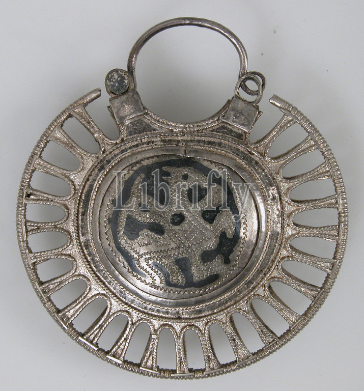 Temple Pendant, Filigree Border, 11th–12th century, Kiev, Kievan Rus, Silver, niello, Overall, 2 x 2 3/16 5/8, 5.1 5.5 1.6 cm, Metalwork-Silver, temple, pendants, decorated, side, griffins, mythical creatures, popular, Byzantine art, interlace patterns, relate, Viking traditions, Rus, founders