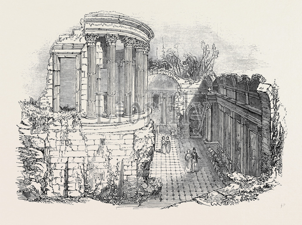 temple, vesta, pillar, 1845 engraving, engraved image, history, illustrative technique, engravement, victorian, arts, culture, retro styled, vintage, retro, arkheia