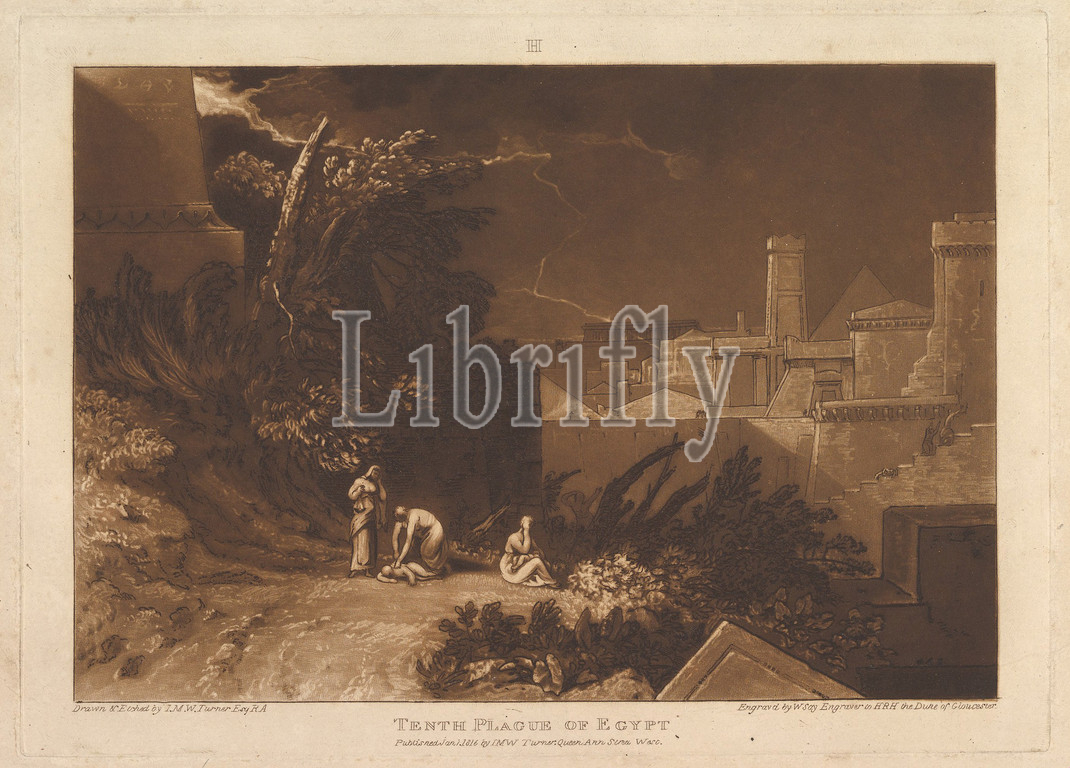 Tenth Plague, Egypt, Liber Studiorum, part XII, plate 61, January 1, 1816, Etching, mezzotint, first state, four, plate, 8 3/16 x 11 7/16, 20.8 29.1 cm, Prints, Designed and etched by Joseph Mallord William Turner, British, London, 1775–1851, Turner distilled, ideas, landscape, Latin, Book, Studies, series, seventy prints, plus, frontispiece published, 1807, 1819, establish, compositions, brown watercolor, drawings, etched outlines, copper plates