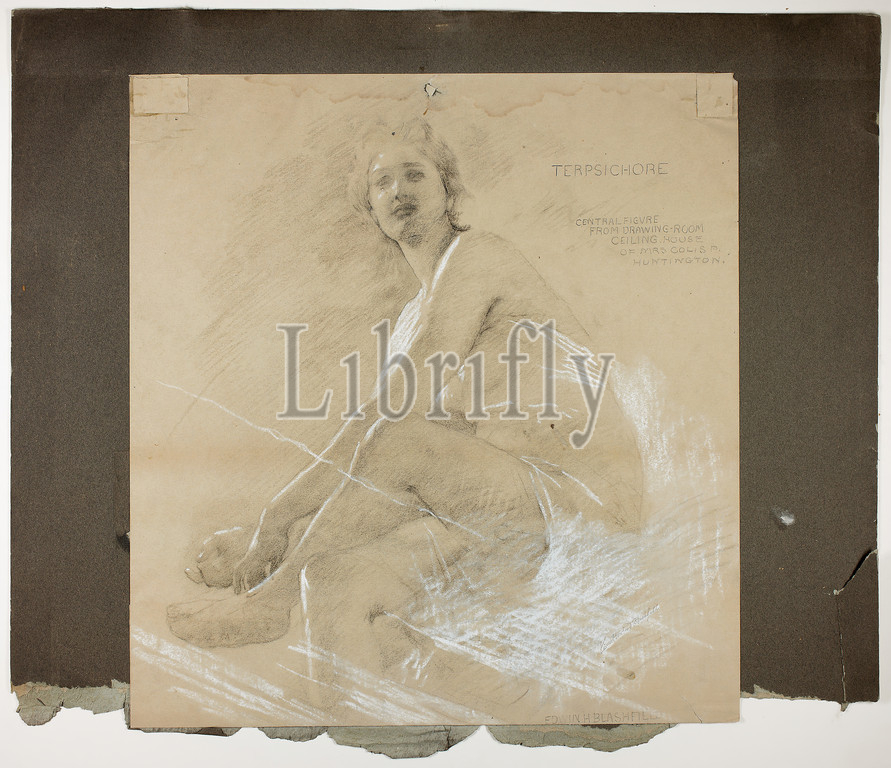 Terpsichore (recto), and Dancing Female Figure (verso), Mural Studies for Drawing Room Ceiling, Residence of Collis P. Huntington, now Yale University Art Gallery, c. 1894, Edwin Howland Blashfield, American, 1848-1936, United States, Charcoal with stumping and erasing, heightened with white chalk (recto), and charcoal with touches of white chalk (verso), on folded cream wove paper with blue fibers, tipped on gray wood-pulp laminate board, 491 x 459 mm
