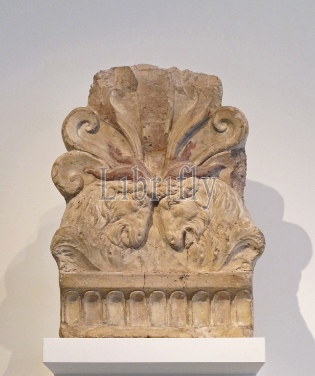 Terracotta antefix, Augustan, late 1st century B.C.–early 1st century A.D., Roman, Terracotta, H.: 14 1/4 in. (36.2 cm), Terracottas, The palmette-shaped antefix is decorated with the butting heads of two billy goats. Such representations were popular motifs in ancient art but they may have had special significance in imperial Rome since the constellation Capricorn was adopted by the emperor Augustus as his own lucky star sign and appeared on coins and legionary standards
