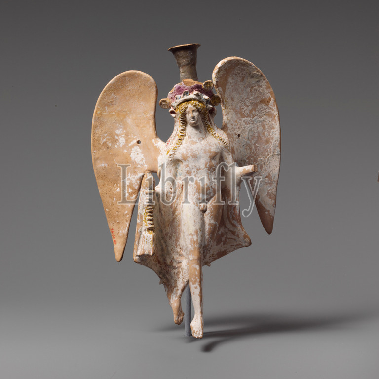 Terracotta lekythos in the form of a flying Eros, Late Classical, 2nd half of the 4th century B.C., Greek, Attic, Terracotta, 8 3/4in. (22.2cm), Vases, The figure holds an incense burner. Although vases in figural form were known in Greek art since early Archaic times, during the fourth century B.C., a particularly elaborate combination of vase and terracotta developed