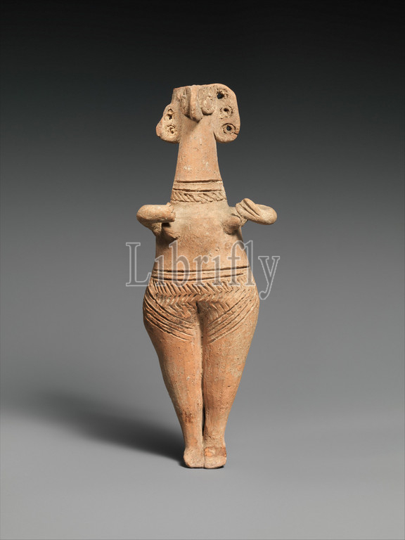 Terracotta statuette, woman, bird face, Late Cypriot II, ca, 1450–1200 B.C, Cypriot, Terracotta, hand, H, 7 9/16, 19.2 cm, Terracottas, figurine, typical, Cypriot coroplastic, art, Cypriot, II, III periods, type, pubic triangle, accentuated, breasts, shown, Syrian origin, sculptors, created, own variations