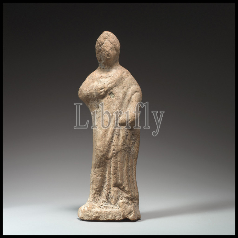 Terracotta statuette of a woman standing, Late Classical or Hellenistic, 4th–3rd century B.C., Greek, Terracotta, H. w/ stand: 6 in. (15.2 cm), Terracottas, Standing, draped statue of a woman.