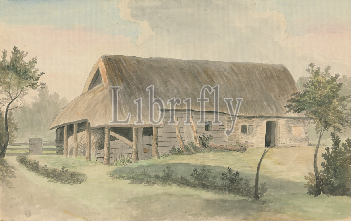 Thatched-roof Barn, Edward Francis Burney, 1760–1848, British, Watercolor, pen, black ink, medium, slightly textured, cream laid paper, Sheet, architectural subject, barn, fence, hay, thatched roof, trees