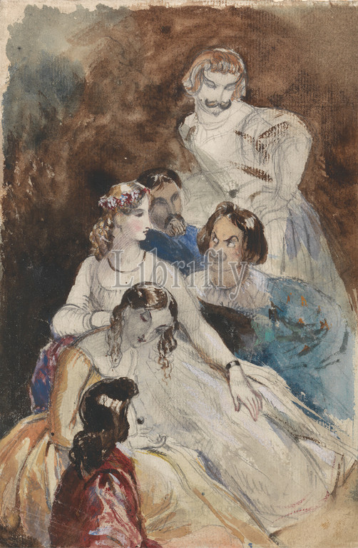 Theatrical Group, Theodor von Holst, 1810–1844, British, Watercolor, gouache, graphite, medium, slightly textured, cream laid paper, Sheet, Costumes, figure study, men, performers, theater, women