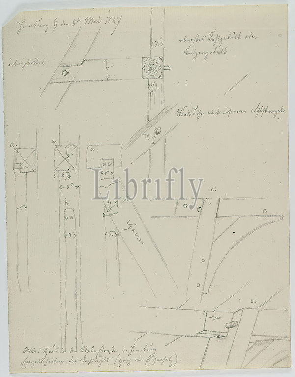 Theodor Bülau, Alter Convent, Hamburg. Details roof construction, paper, pencil, drawing, sheet size: height: 24,2 cm; width: 19 cm, inscribed and dated: recto: in lead: Hamburg [Saturnsymbol] the 8th of May 1847, inscribed: recto u.: Altes Haus in der Steinstraße in Hamburg, individual views of the roof[?] (entirely of oak wood, sketches, drawing, graphics, roof ,house, building, architectural details