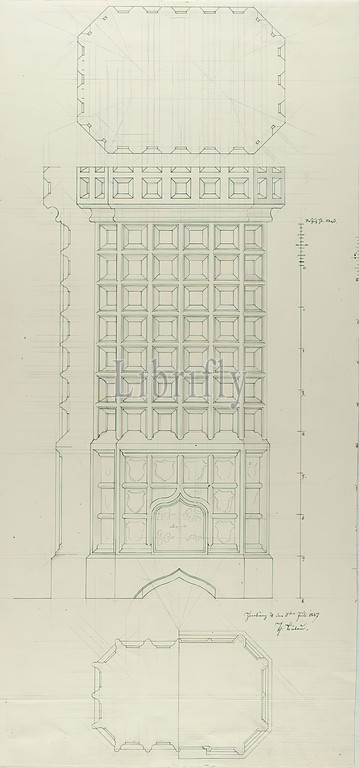 Theodor Bülau, Building of the Patriotic Society, Hamburg. Design of a tiled stove, paper, pen-and-ink drawing, sheet size: height: 48 cm; width: 22,7 cm, signed, dated and inscribed: recto: in ink: Hb. ♃ [Jupiter symbol] July 8th, 1847, Th. Bülau, design drawings, stove, coat of arms, heraldic symbol