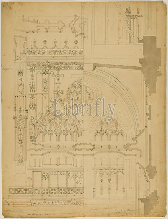 Theodor Bülau, Cathedral, Regensburg. Interior and exterior view of the left double window zone above the main portal with two floor plans and mural section, paper, pen, ink, pencil, pen and ink drawing, washed, sheet size: height: 64.5 cm; width: 54.2 cm, signed and dated: recto: in ink: Theodor Bülau drawn in November 1835, inscribed: recto: in lead: Regensburg Cathedral, West Facade, A. Bülau, drawing, graphics, church interior, church building and equipment (sacral building), capital (column, pillar), base (column, pillar), architectural details