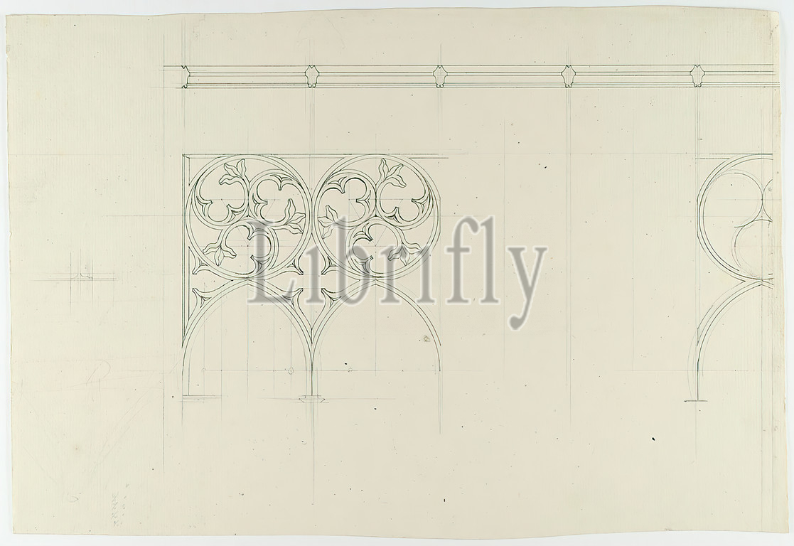 Theodor Bülau, Cathedral, Regensburg. tracery detail of the canopy vestibule of the main portal, paper, pencil, drawing, sheet size: height: 23,8 cm; width: 35 cm, unmarked, Drawing, graphic, tracery ornament, church interior