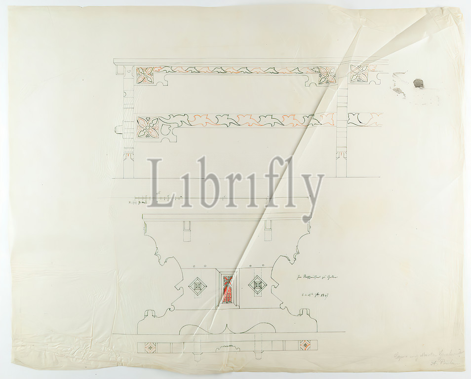 Theodor Bülau, City Hall, Goslar, Cheek table, Front view, cut, tracing paper, pencil, ink, pen, pen, ink drawing, colored, sheet size, dated, recto, in ink, Im Rathaussaal zu Goslar, ☿, Merkursymbol, den 15ten 7ber 1847, inscribed, in lead, Copie nach Martin Gensler?, Bülau, draft drawings, design, table, ornaments, arts, crafts, arts, crafts, industrial design