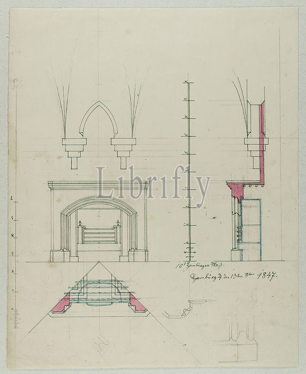 Theodor Bülau, design of a fireplace, paper, pen-and-ink drawing, colored, sheet size: height: 29 cm; width: 23,5 cm, signed, dated and inscribed: recto: in ink: Hb. ♃ [Jupitersymbol] the 13th of 8ber 1847, fireplace/stove/stove, design drawings, fireplace