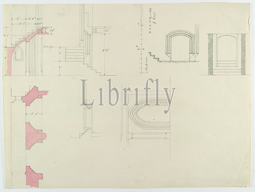 Theodor Bülau, duplex, Raboisen 66-68, Hamburg. Cellar window, entrances and stairs with views, sections and floor plans, paper, pen, ink, pencil, pen and ink drawing, colored, sheet size: height: 31.4 cm; width: 23.7 cm, signed, dated and inscribed: recto: in ink: Hb. ♃ [Jupiter symbol] April 3, 1845, Th. Bülau, sketches, window, staircase, stairwell, section through an architecture