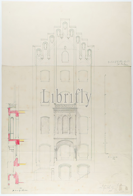 Theodor Bülau, Hübbe'sche Haus, Ferdinandstr. 65, Hamburg. 3. design of the facade. View and section, paper, pen, ink, pencil, non-opaque watercolor, pen and ink drawing, colored, total (2 parts ): height: 55 cm; width: 37,3 cm, inscribed and dated: recto: in ink: Hb. ☾ [symbol of the waning moon] the 24th of June, 1844, Hb. ☾ [symbol of the waning moon] the 29th of July, 1844, inscribed: recto: in lead: gable f. Hübbe's house, A. Bülau, design for the balcony, von Hübbe Haus, A. Bülau, design drawings, facade ,house, building, balcony, architecture