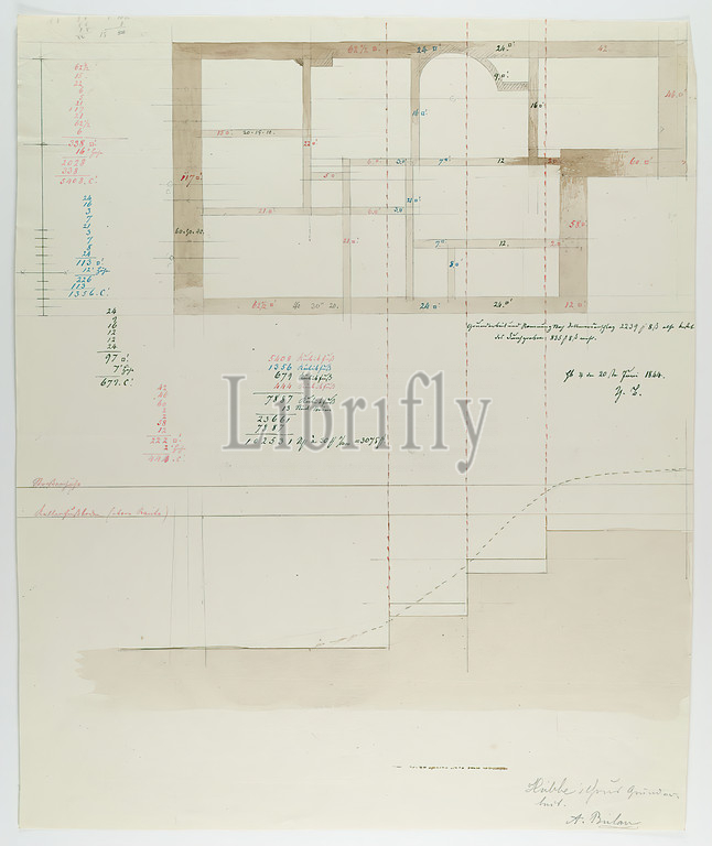 Theodor Bülau, Hübbe'sche Haus, Ferdinandstr. 65, Hamburg. Floor plan of the foundation walls, paper, pen, ink, pencil, pen and ink drawing, washed, sheet size: height: 40 cm; width: 32,8 cm, signed, dated and inscribed: recto: in ink: Hb. ♃ [Jupiter symbol] the 20th of June 1844, Th. B, inscribed: recto: in lead: Hübbe Haus, Grundarbeit. A. Bülau, design drawings, section through an architecture, draft, plan of a building