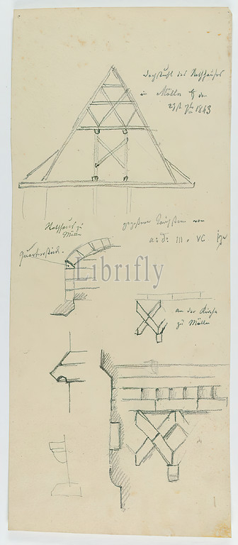 Theodor Bülau, Mölln. Roof truss construction and segmental arch of the town hall. Frieze detail of St. Nikolai, paper, pencil, drawing, sheet size: height: 26.8 cm; width: 11.4 cm, inscribed and dated: recto: in lead: Mölln ♄ [Saturnsymbol] den 23sten Fbr. 1843, free graphics (drawing, graphics), sketches, architectural details, gables, town hall, church construction and equipment (sacral building)